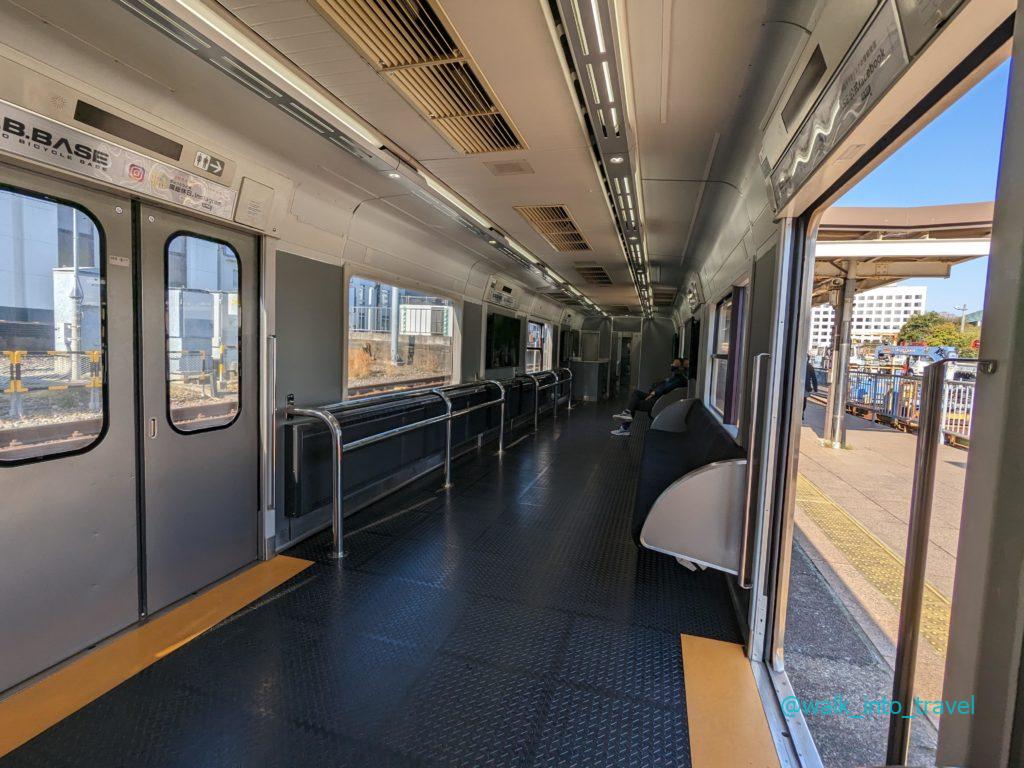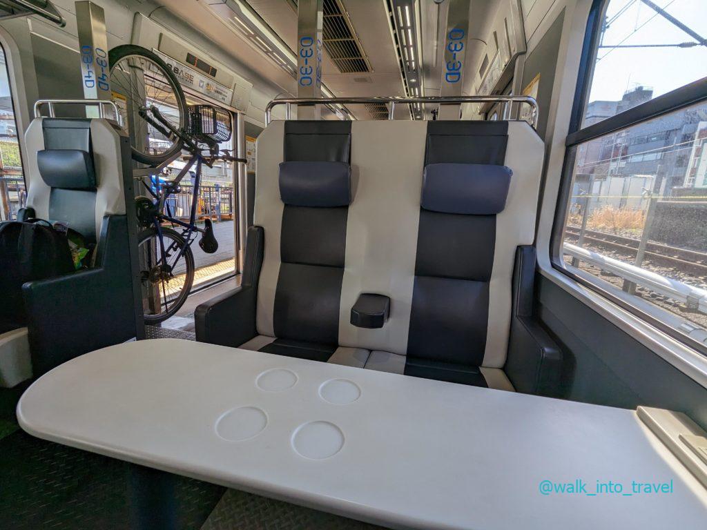 サイクリストにとっての列車というコンセプトではあるですが、自転車を持っていなくても乗車できるのが鉄道旅を行う人にとって嬉しいポイント。また、テーブルがあったりコンセントがあったりと充実した座席になっているます。銚子まで運行する際は都内両国駅からの所要時間は2時間半ほどで、ゆったりとした田舎の景色を楽しむことができます。特にラウンジ車両に広がる大きな車窓から眺めるフルスクリーンな風景は、この旅のハイライトでした。