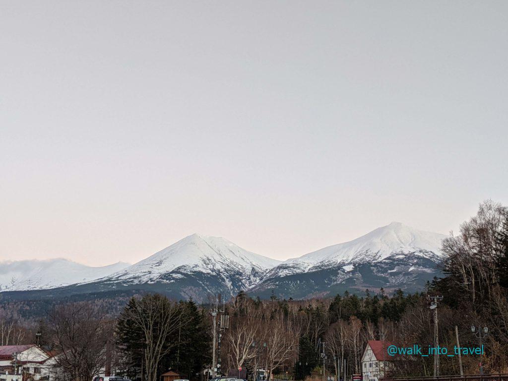 壮大な車窓を眺めて揺られ、40分。秋の初めなのに雪山が聳え立つ白金温泉へと到着しました。