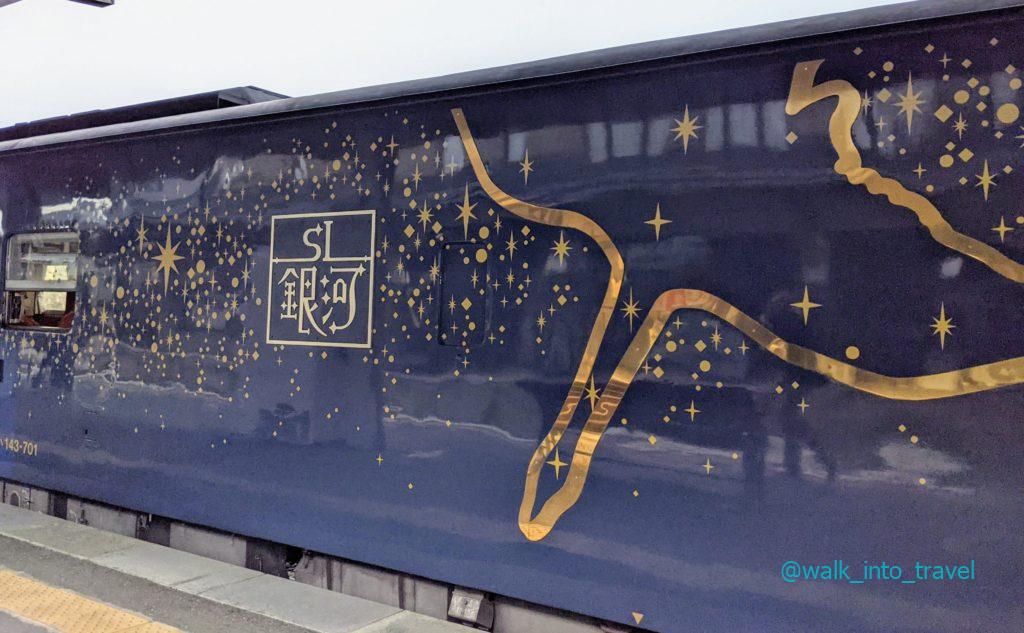 SL銀河は2014年に登場した、一度引退したSLを利用した観光列車。SLが牽引する客車に描かれた星座や動物の素敵なイラストが印象的な列車です。