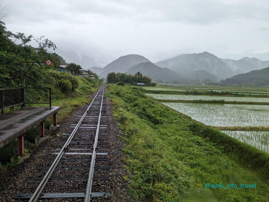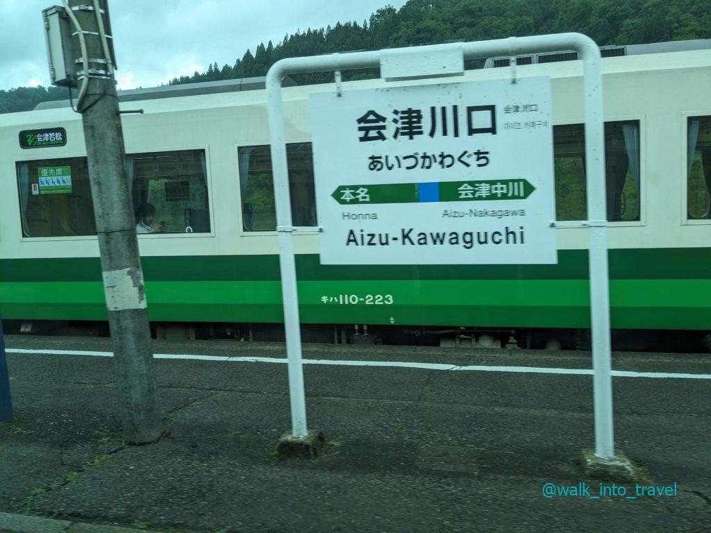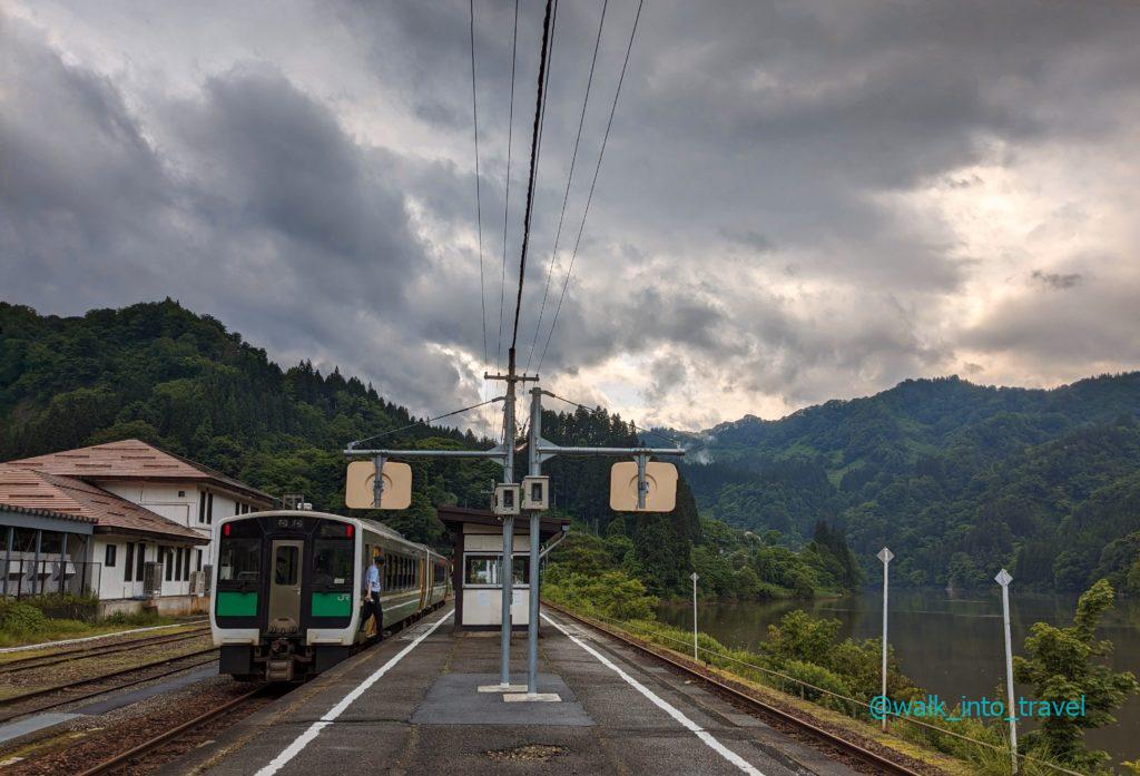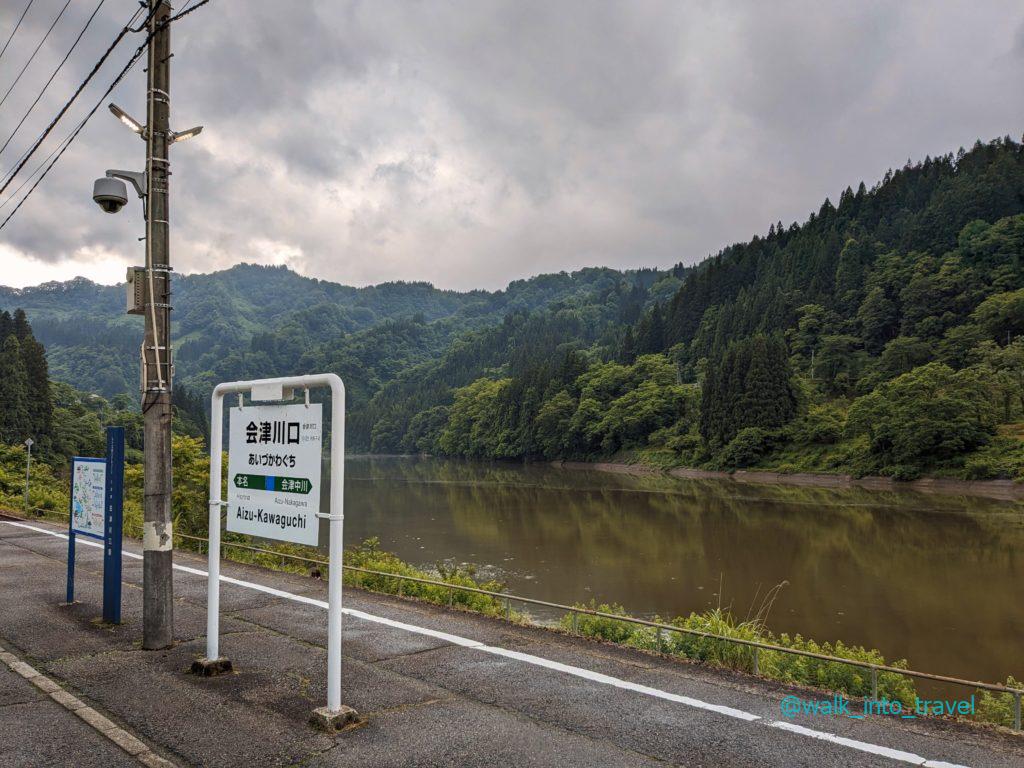 絶景の先にはセーブポイント会津川口駅があります。ここは列車交換のために30分程待つ駅で、その間車両の外に出て休憩できます。しかも会津川口駅はこれまた絶景駅。溪谷の間にある川の畔の駅で風情たっぷりでした。
