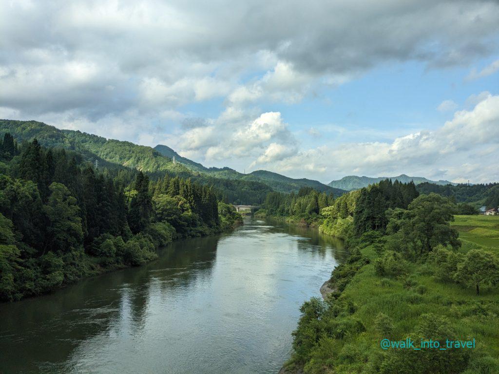 座れても座れなくても只見線の旅はスタートです!絶景を見るという観点では最初の1時間位は準備体操です。とはいえ広大な田園地帯は都会では見れないのでこれだけでも旅情溢れる景色です。会津坂下駅を過ぎたあたりから山に分け入り、会津桧原駅過ぎてから絶景の本番。最初の橋を渡ります。